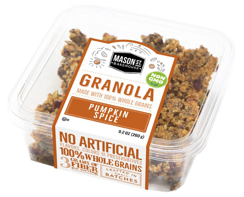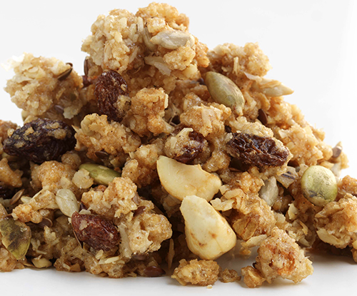 INGREDIENTS: Fruit and seeds (raisins, dates, pumpkin, flax, sunflower, cranberries), whole grain rolled oats, sugar, honey, sunflower oil, crisp rice (whole grain brown rice, cane syrup, sea salt), pecans, pumpkin puree, spice, almonds, cashews, walnuts, salt.