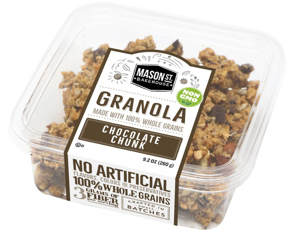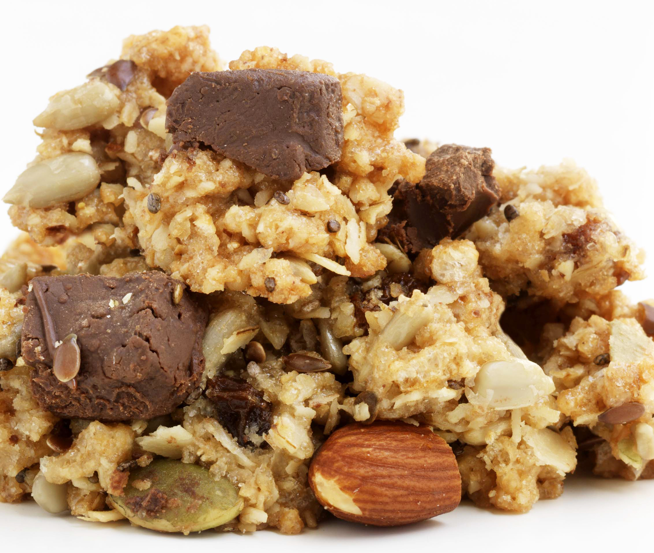 Ingredients: Fruit and seeds (raisins, sunflower, dates, pumpkin, flax, chia), whole grain rolled oats, sugar, honey, sunflower oil, chocolate chunks (sugar, chocolate liquor, cocoa butter, soybean lecithin [an emulsifier], vanilla extract, salt), almonds, crisp rice (whole grain brown rice, cane syrup, sea salt), salt.